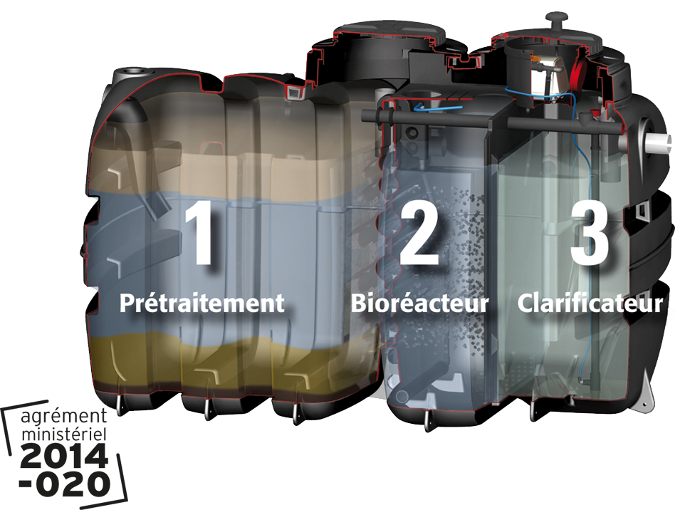 La microstation permet de regrouper les 3 fonctions de l’épuration des eaux usées : prétraitement, traitement biologique par le bioréacteur, et épuration des eaux par le clarificateur.